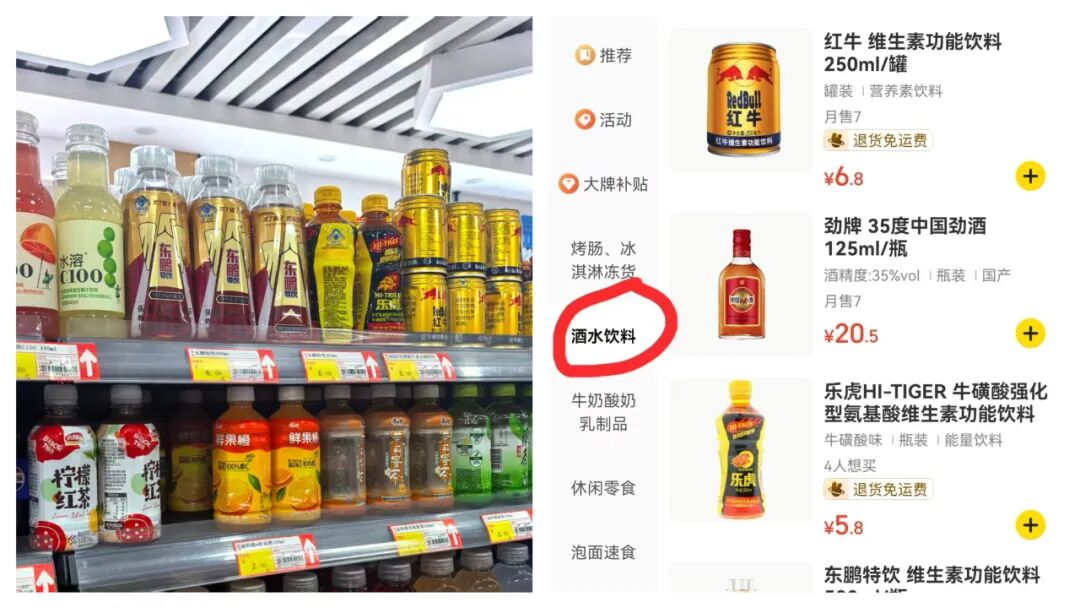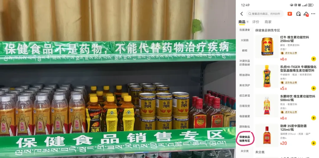 (左图为:超市货架上,保健食品与普通饮料混杂摆放,未设专属区域及提示牌。右图为:外卖平台中,保健食品未单独分类,与普通商品混列。)