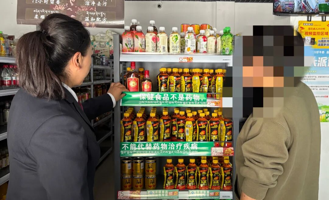 接到线索后,扎囊县人民检察院公益诉讼检察干警迅速行动,通过实地走访、现场监督,精准锁定县域内超市保健食品经营领域的三大“漏洞”:一是未按规定设立规范的专区;二是缺乏合规的销售提示标识;三是带有“小蓝帽”标识的保健食品与普通饮料混杂摆放,消费者因混淆误购的风险突出。在检察履职中,扎囊县人民检察院不止于“点问题”,更是当面为商户讲清“小蓝帽”认知要点与摆放规范。在启动公益诉讼审前程序督促后,行政机关立即落实,将问题整改到位。